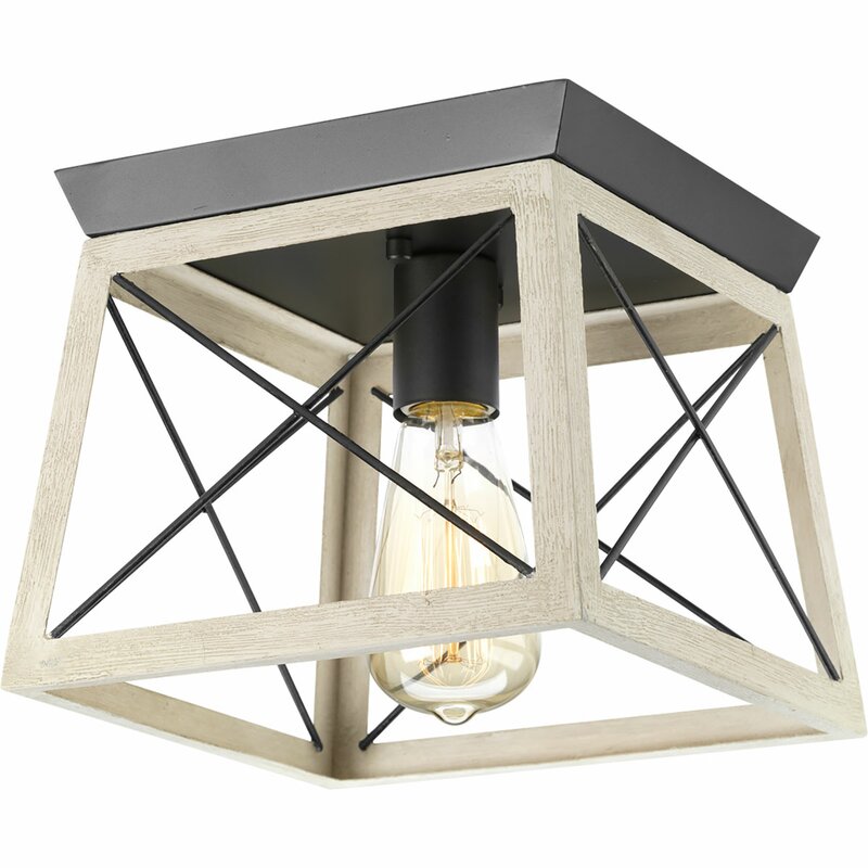 Create a cozy and comfortable home atmosphere with this rustic One-Light Flush Mount. The open-caged light fixture features a faux-wood frame with a coastal-inspired finish. A farmhouse-inspired X-brace design stretches across each side of the frame recalling old barn doors and rustic farmhouse gates. From inside the enclosure peeks a metal light base waiting to hold a light source as it exudes a comforting country glow. A bold plate accents the top of the structure as thin metal bars anchor the rustic light fixture to the ceiling. The ceiling light’s farmhouse-inspired design is ideal for any hallway, kitchen, sitting room, or foyer in coastal, craftsman, farmhouse, rustic, urban industrial, and vintage electric interiors.