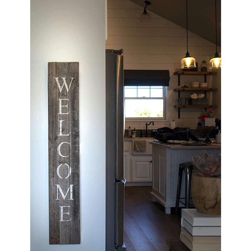 Dimensions and color: 5ft tall, 9 inches wide, 1.125 inches depth vertical welcome sign. Naturally reclaimed wood is truly a thing of beauty. The aging process that occurs over time gives it a unique, weathered appearance and a beautiful, color that simply can’t be replicated in a factory.