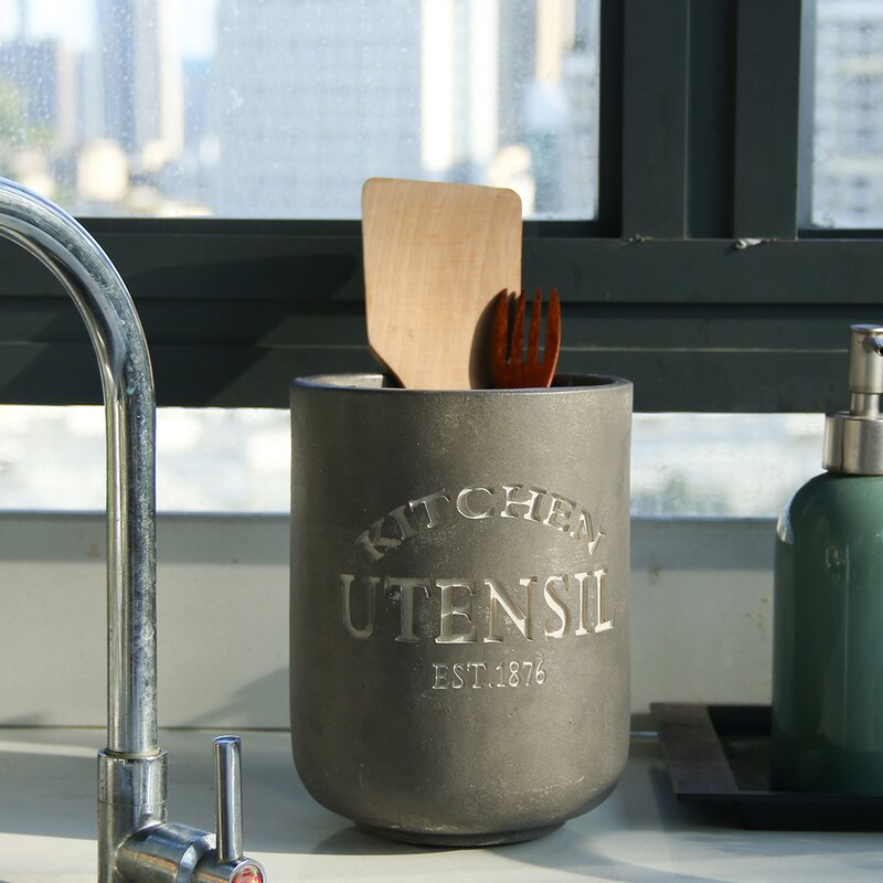 Give your rustic, farmhouse kitchen a fun decor boost with our Ceramic Kitchen Utensil Crock. This vintage-inspired piece features a gray polyresin jar with an engraved text design. Place kitchen utensils inside, so your kitchen storage can fit your incredible style!