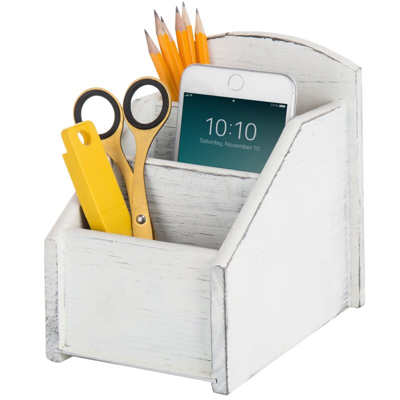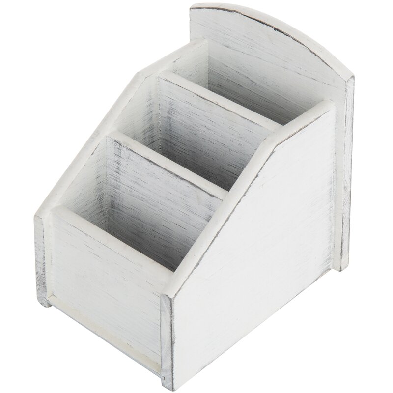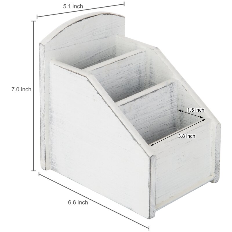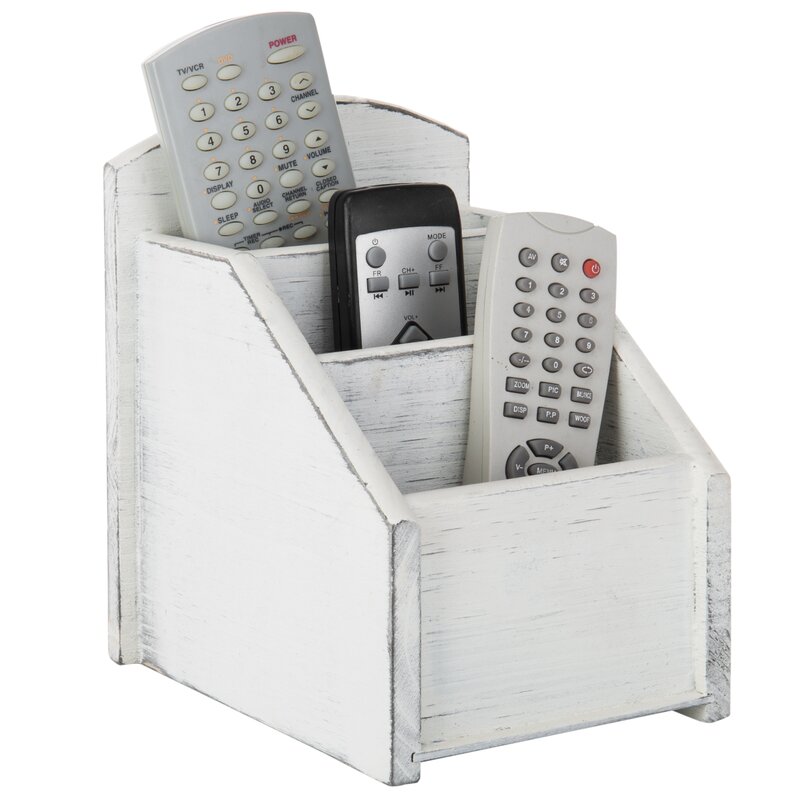Keep your remote controls easily accessible with this vintage white remote control caddy. The wide bins each hold multiple remote controls, but can also be used for desk items or tableware. The small footprint takes up minimal desk or counter space, and the angled design holds items of various sizes.