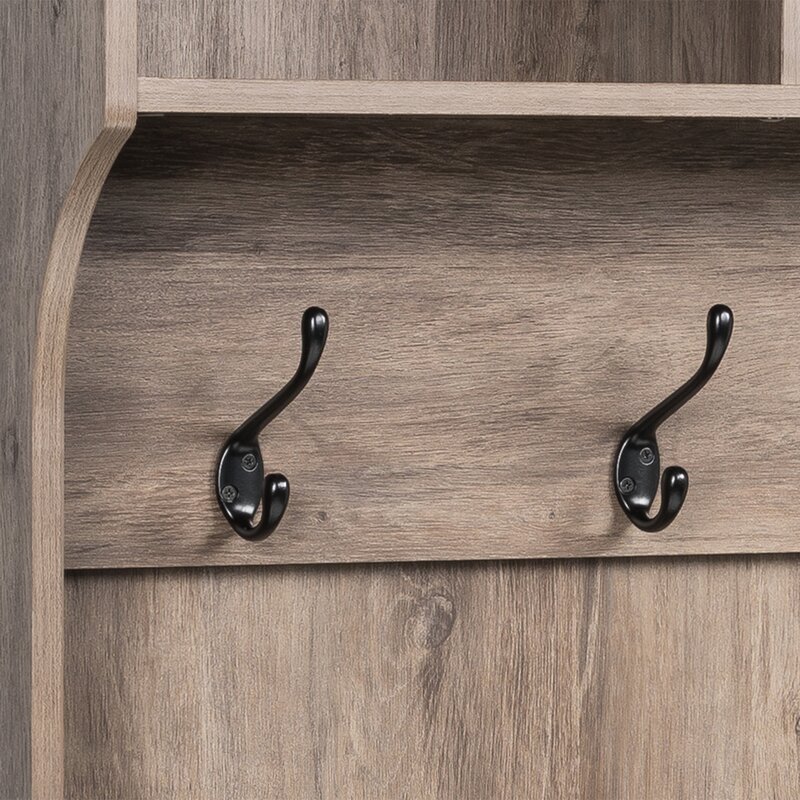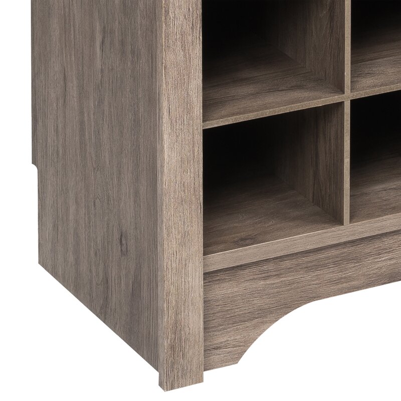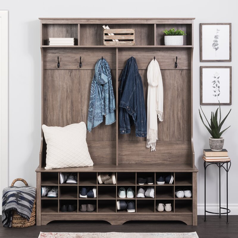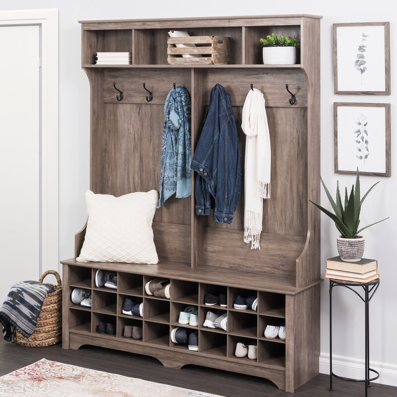 This efficient hallway organizer features a wide bench perched above 24 integrated individual footwear cubbies capable of accommodating shoe pairs of up to men’s size 13. Hang your coats or accessories from the six strong double coat hooks, and store your large items out of the way in one of the three upper compartments. Place this versatile furniture in your mudroom, laundry room, or entry hall to add organization to your home. This all-in-one hall tree bench and shoe storage hutch ships flat packed and ready to assemble, with an included anti-tip restraint for security. Built with non-toxic, laminated composite woods, this hallway tree bench storage unit will reliably protect your shoes and accessories.