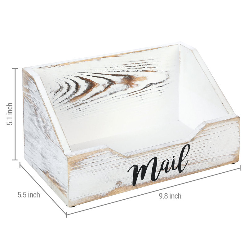 Featuring a distressed whitewashed finish and cursive writing design, this wooden tabletop mail holder box keeps your mail, letters, or other important documents well organized and cut down on your paper clutter. “Mail” label in black stenciled cursive lettering on the front stylishly calls out exactly where your letters belong. Perfect for organizing your mail, letters, or other important documents, this mail sorter sits nicely on your desk or counter top without taking up too much space. It will be an ideal addition to your home or office.