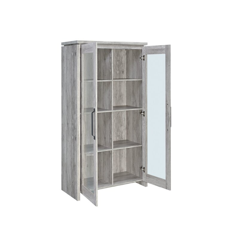 This tall curio cabinet makes for an impressive addition to a well-appointed home. The charming cabinet has a classic sense of style and design. Two glass doors with contrasting dark hardware give the curio a distinguished appearance. The doors provide easy access to eight compartmentalized shelves offering abundant storage space. Finished in grey driftwood for a stylish look appropriate for any living room or den.