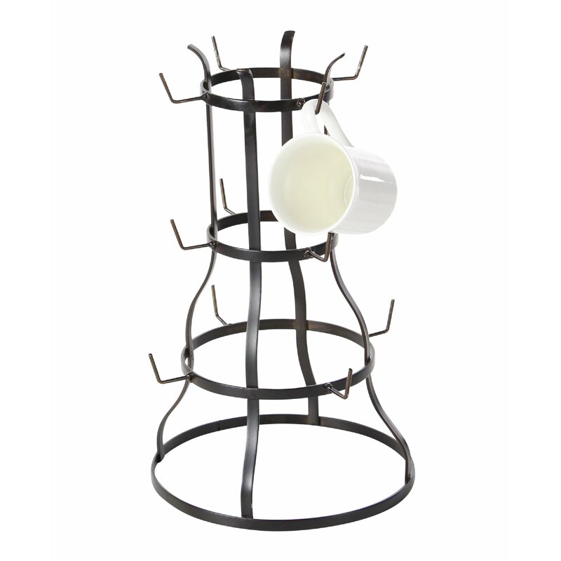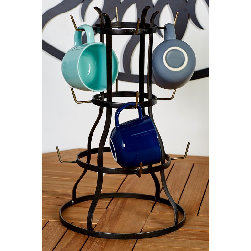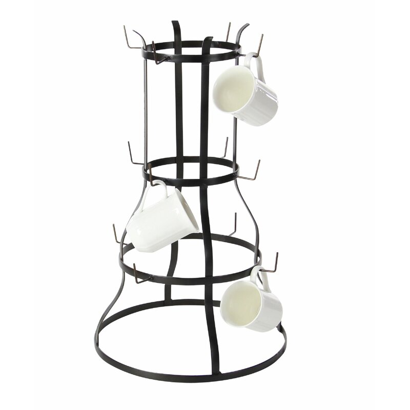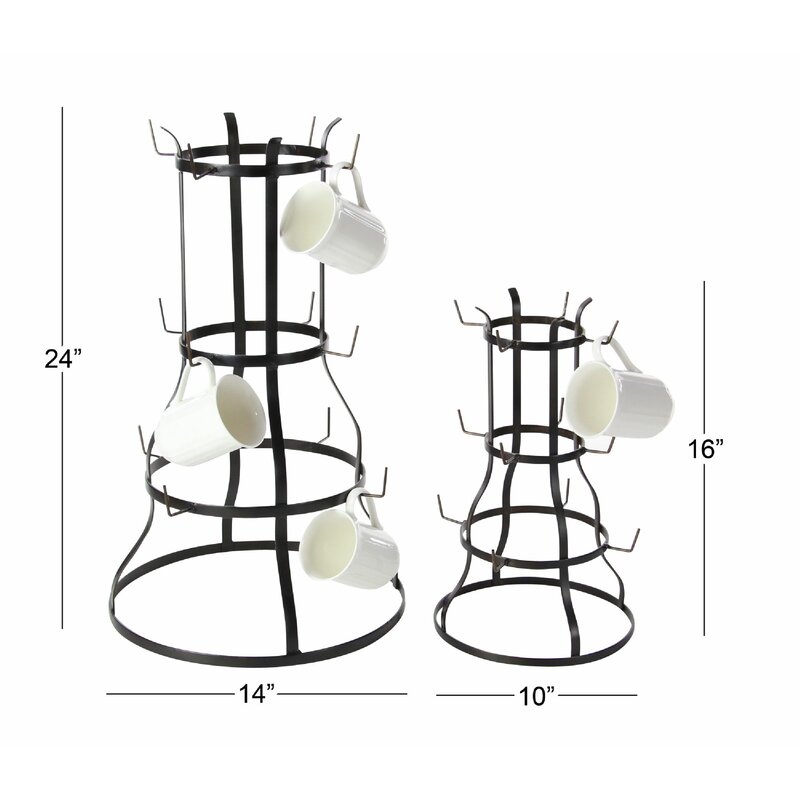 Bring a finishing touch to your home with an inviting appeal with this classic mug holder. Give your surface space a balance look with this adorable decorative piece. This set of bell-shaped mug racks will bring some warm charm into your home. Place this set on top of any counter or kitchen table to complete a farmhouse or industrial look. Designed with black rubber stoppers at the base that prevent scratching furniture and table tops, as well as sliding around. This item ships in 1 carton. Two sizes with 24 mug hooks total. Suitable for indoor use only. Each hooks holds 5 to 8 pounds. Each set comes with 2 black metal mug racks. Farmhouse style.