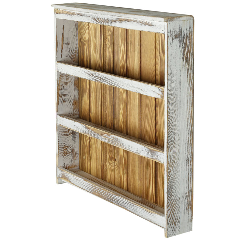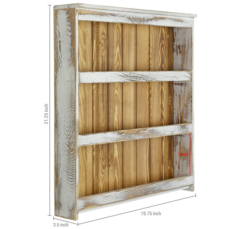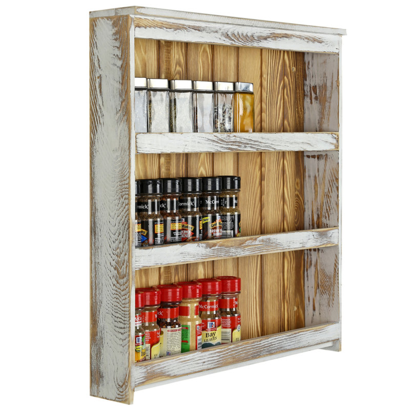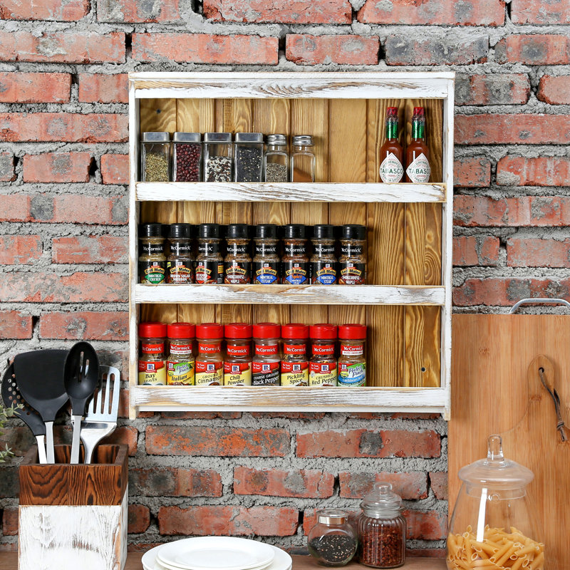 Organize your favorite spices and have them conveniently close at hand with this large wall-mounted rustic chic whitewashed and burnt solid wood spice jar holder shelf rack. This wall-mounted rack can hold standard-size spice bottles and provides plenty of space for essential spices while having a reasonable size to fit the small space. The open design allows you to easily find the condiments you want.