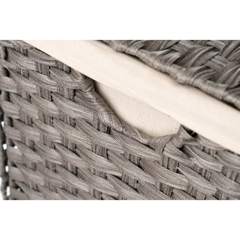 Made from sturdy synthetic plastic wicker, the basket comes with a removable liner that can be washed in cold water on a gentle cycle. Lay flat to dry.