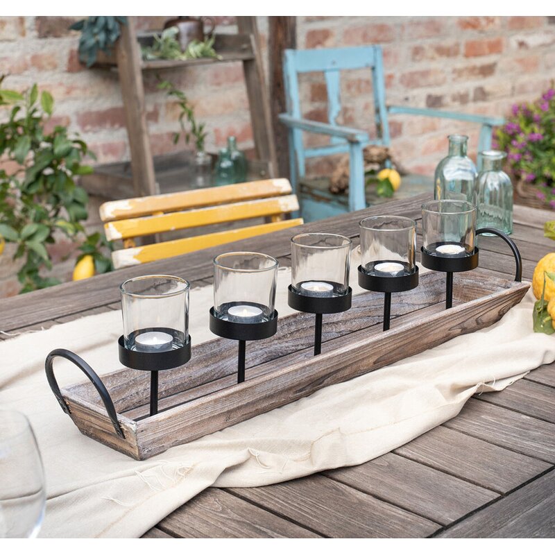 This candelabra is crafted from weathered wood and features five elevated, metal pedestals topped with cylindrical glass hurricanes. Arched, metal handles on each end make it easy to move this accent piece.
