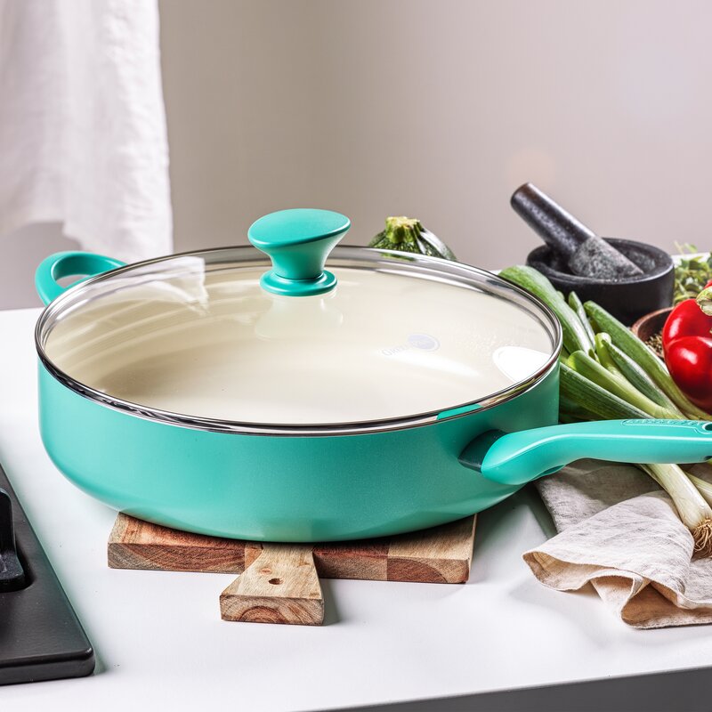 Add a touch of color to your kitchen with the vibrant style of the Green pan Rio collection. This versatile sauté pan is perfect for one-pan meals and is designed to make any dish better. How? This pan features our Thermolon healthy nonstick coating—an easy release and wipes clean coating that’s free of PFAS, PFOA, lead, and cadmium for worry-free cooking. Unlike many other nonstick coatings, it will never release toxic fumes, even if it’s overheated. This durable coating is reinforced with diamonds to provide peak nonstick performance longer. The pan’s heavy-duty construction gives you even heat distribution while the stay-cool bakelite handle gives you a comfortable grip and total control. A durable glass lid gives you an easy view of your meal in progress without sacrificing heat.