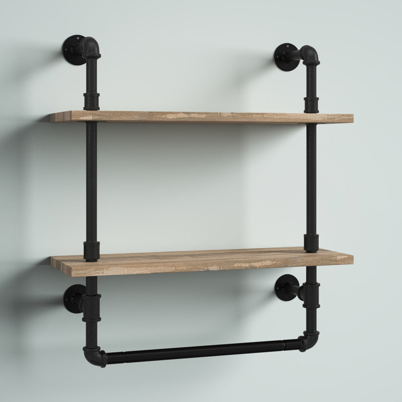 This 2-tiered floating shelf brings classic style and convenient storage space to any wall. It has a metal frame with a black finish, and it has two engineered wood shelves in a rustic brown hue. The shelves are ideal for displaying small plants and decor items, and a metal bar at the bottom doubles as a towel rack for your kitchen or powder room. With its lived-in vibe and versatile palette, this wall-mounted shelf complements industrial and traditional decor styles alike.