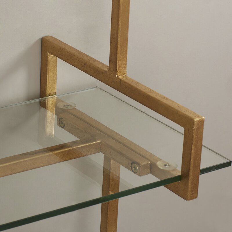 Add a little extra storage and some seriously glam vibes to your space with this eye-catching shelf. Its frame is made from iron with an antique gold finish and has an open frame with rectangular supports joined by slim bars for an art deco-inspired vibe. Plus, its four shelves are made from glass for a sleek, airy vibe. And since it measures 40” high and 31.5” wide, it’s a great option for filling up a blank wall. This shelf mounts with an anchor and screw method.