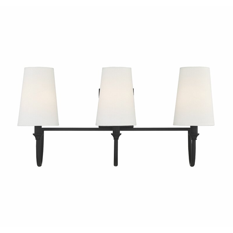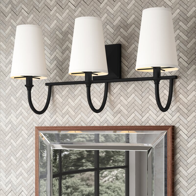 This 3-light vanity light is perfect for breathing new life into your bathroom. Its steel design is rated for damp locations, and it features a square backplate, curved arms, and simple finials accents for a timeless look. A trio of white fabric empire shades rounds out this piece, diffusing light from compatible 60W candelabra-base bulbs (not included) in an ambient direction. Plus, we love that this vanity light is compatible with a dimmer switch, allowing you to adjust the lighting mood to your liking.
