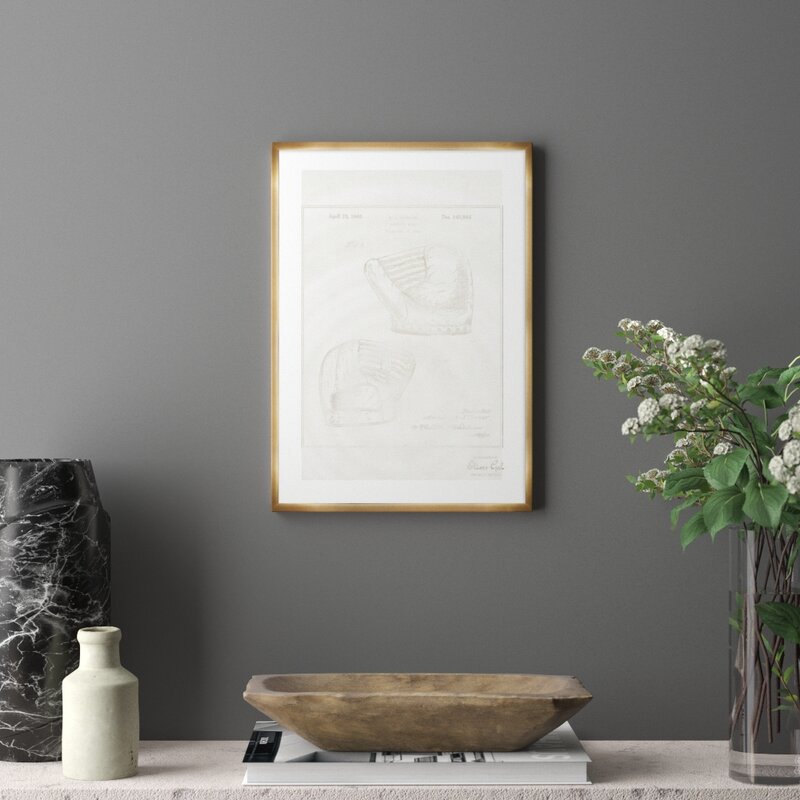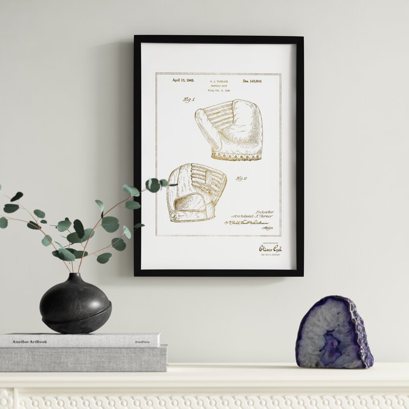 This wall art brings a baseball theme and a vintage-inspired feel to any space. It’s printed on a rectangular piece of paper with a vertical orientation, and it’s surrounded by a sleek picture frame with a neutral finish. Taken from A. J. Turner’s original design for a baseball mitt, this reproduced blueprint showcases the annotated patent from April 10, 1945. With its antique palette and salvaged aesthetic, it complements traditional and industrial decor styles alike. We love how this piece looks above your living room sofa or home office desk, and it comes with a wall hook for easy setup.