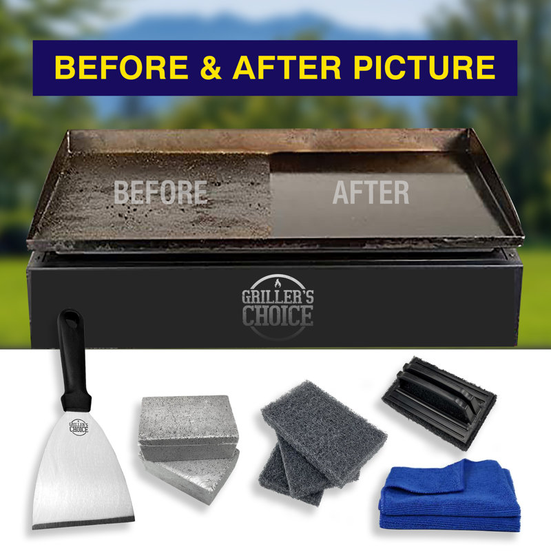 This griddle cleaning tools has all the essentials: griddle cleaning brick (2), griddle scouring pad (3), griddle brush (1), griddle scraper (1), microfiber cleaning cloth (2). This is a must have flat top grill cleaning kit that every person who owns a griddle or grill needs. Buy for yourself or for a gift.