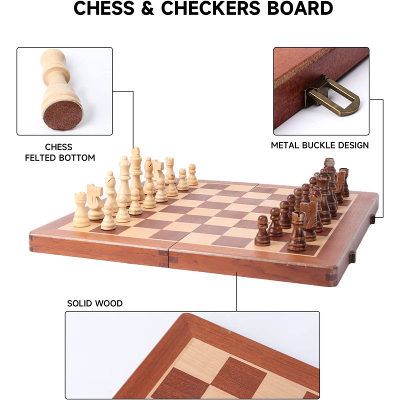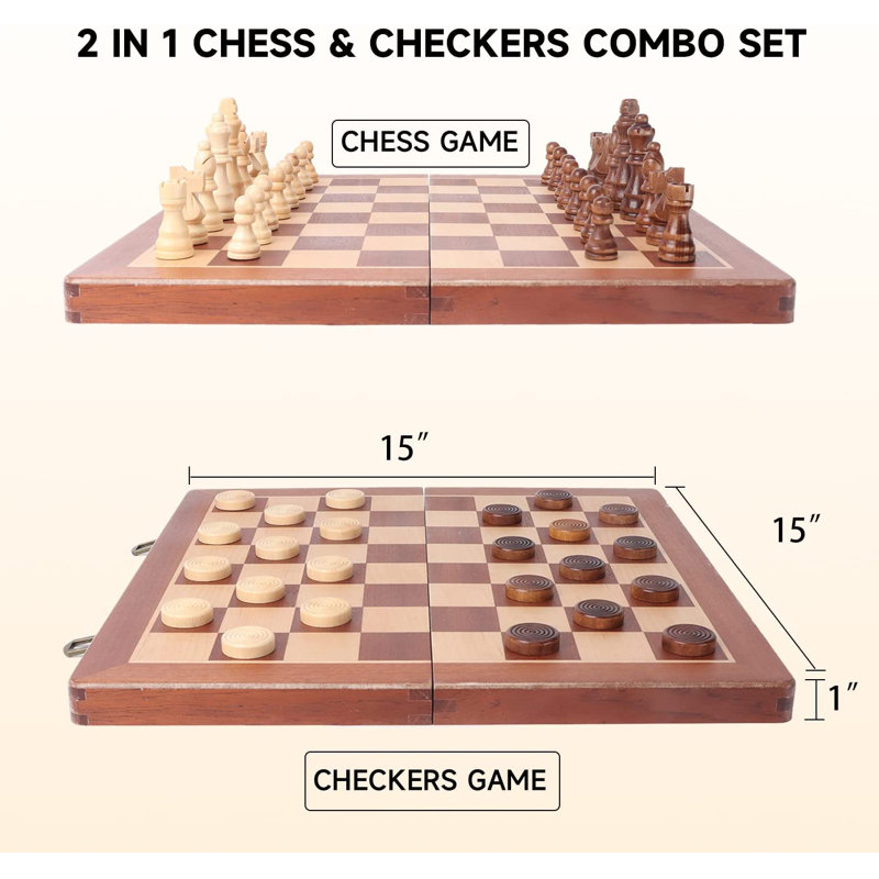 The 2-in-1 chess and checkers board is made from solid wood, with open dimensions of 15 x 15 x 1 inch and closed dimensions of 15 x 7.5 x 2 inches. Inlaid chess board dimensions 1.5-inch squares. You are playing surfaces for chess and checkers games.