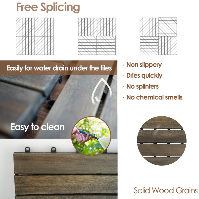 High-quality wood surface – the wooden part of the deck flooring is treated with care, being painted with high-quality water-resistant paint that keeps wood color in bad weather situations for up to 12 months. The deck tiles have solid wood grains and quick-drying surfaces to avoid slippage that can be used on both indoor and outdoor floors.