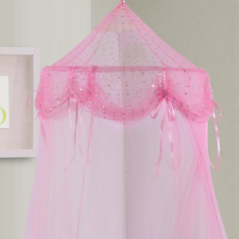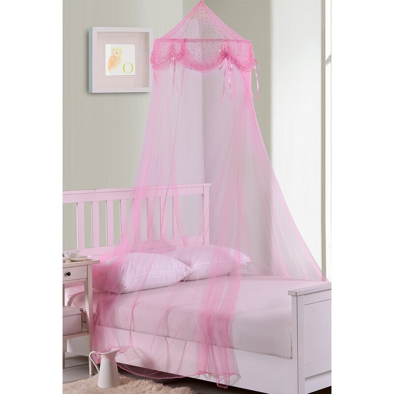 Fun and functional embellished collapsible sheer net hoop bed canopy. Installs easily with one included hook placed into the ceiling. Transforms a bed into a magical wonderland or royal quarters. Suspends from the ceiling on a collapsible wire hoop.