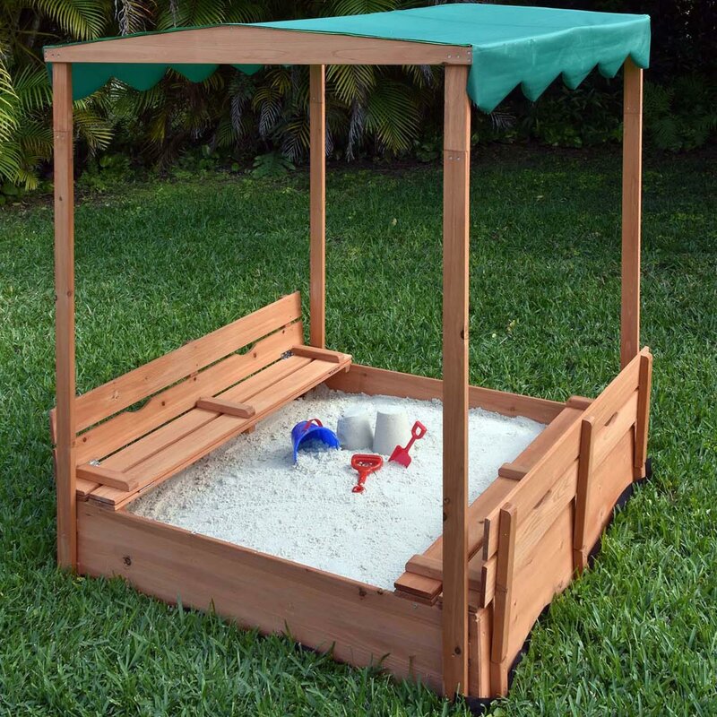 This sandbox with a cover and two convertible bench seats will be a favorite place for your kids to hang out and spend time with their friends. This outdoor sandbox comes with a canopy top to provide proper shade to the kids who play inside. You can conveniently place this covered convertible sandbox in your backyard. This is the best sandbox for kids. More than one kid can play in this covered sandbox for kids since the sandpit has sufficient room inside. The kids can dig, build, play, and have fun together with this sandbox with a cover. Once the kids have finished playing, it is very easy to dismantle it to protect the sand inside the sandbox with a cover for the kids. All you have to do is fold the two bench seats inside the sandbox and keep them over the sandpit. When you do this, the sand remains clean and fresh so that when the kids want to play with it the next time, it would be quite easy for them. Have your kids start having fun with this covered two-bench cedar sandbox with a canopy.