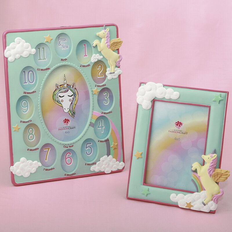 Frame baby’s sentimental photos in these adorable unicorn frames. Fill the collage up month by month, add a separate photo of baby in the 4″ H x 6″ W frame and create an heirloom to last for a lifetime! These frames are made from poly resin and are hand painted in lovely pastel and bold colors with a mint background. The collage offers openings from birth to 11 months and one large opening in the middle for 1 year. The 4″ W x 6″ W also features a raised unicorn with clouds and stars. The frame features a raised unicorn in the top corner with white fluffy clouds, stars and a rainbow.