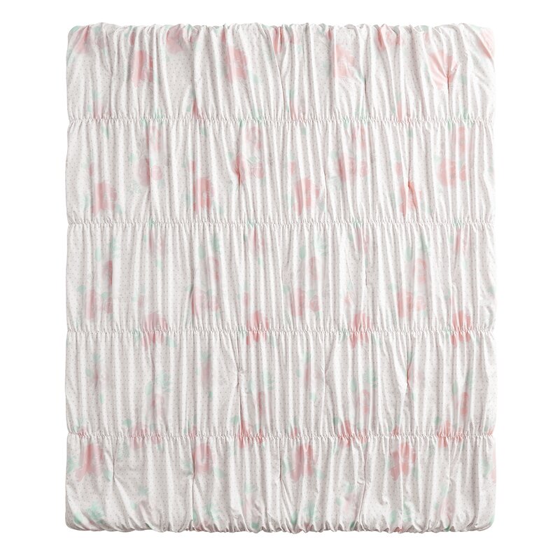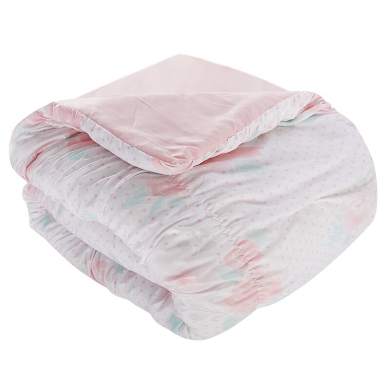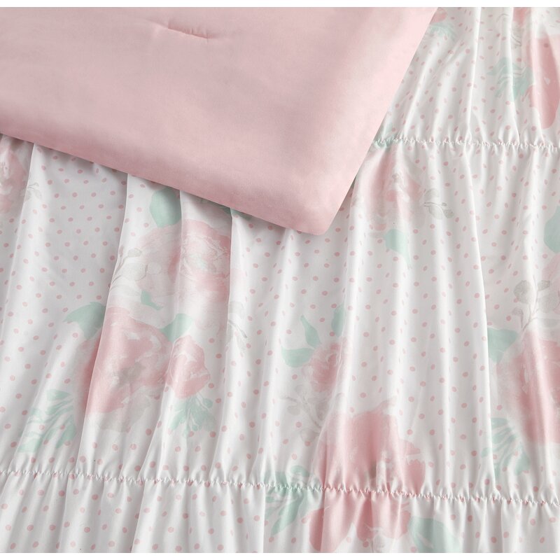 Visually stunning, this comforter set will add a beautiful focal point to any bedroom. The watercolor floral and polka dot pattern is colored in soft shades of pink and aqua on white ground. The comforter and shams feature smocking details. Two fancy decorative pillows are included- a pink square with scallops and a rectangle pillow with ruffles and pink sequin trim.