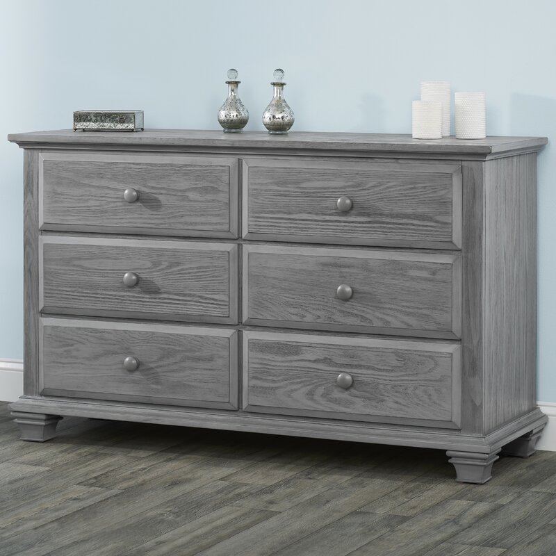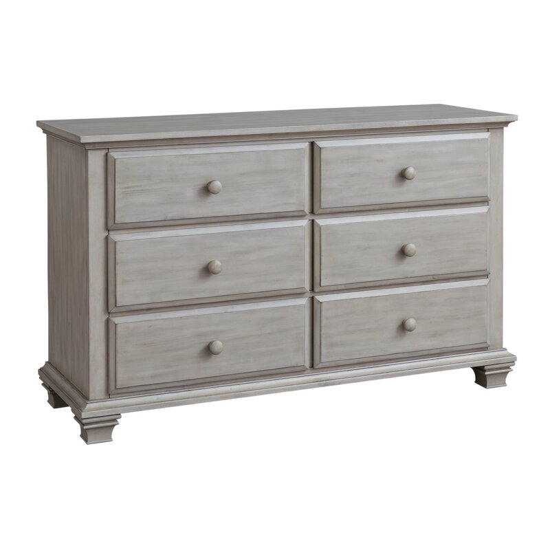 Bring a taste of French country style to your nursery. Crafted of poplar wood in a rustic wash, this dresser features tasteful moldings, round knob pulls, and carved feet. Set on full-extension ball-bearing glides, dovetail drawers offer plenty of storage space for onesies, bibs, crib bedding, and blankets, while the top surface provides plenty of space for a changing pad (not included) or other accessories.