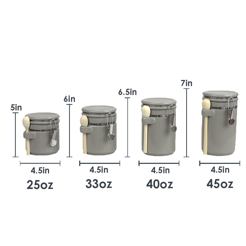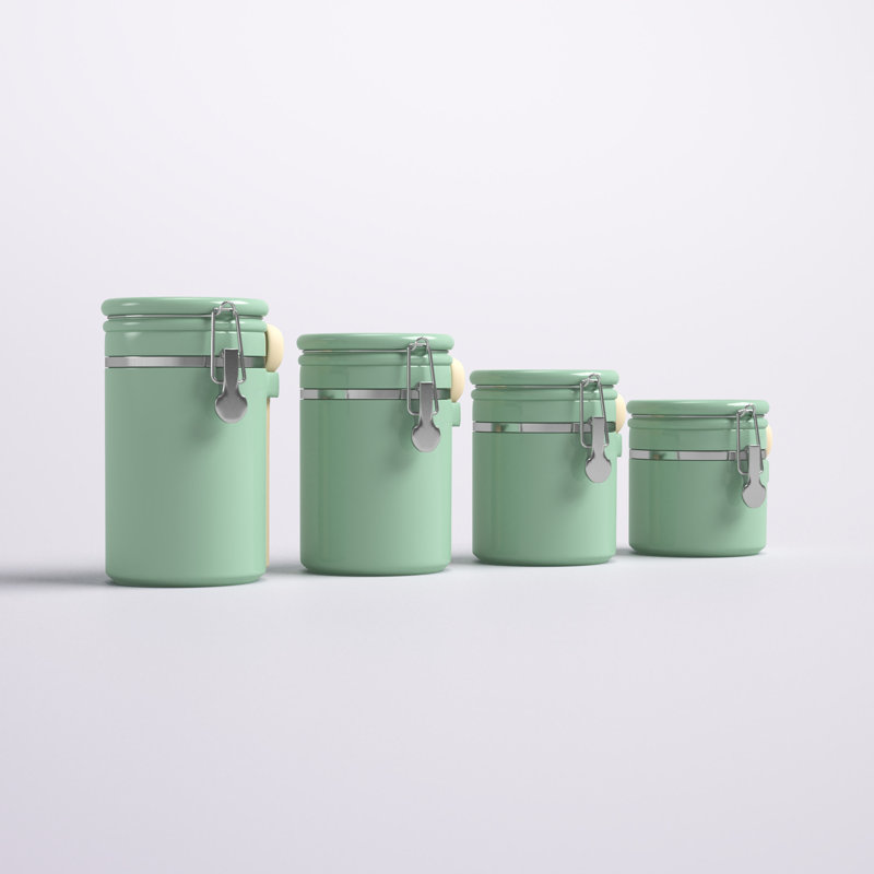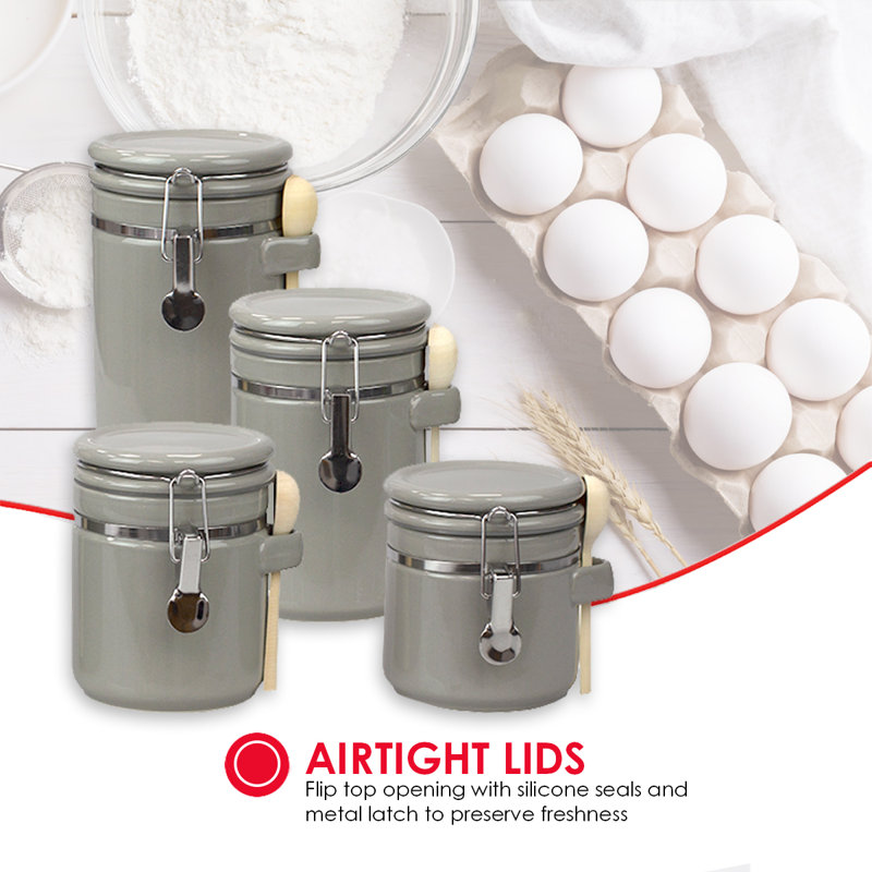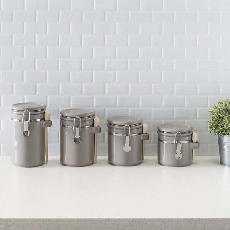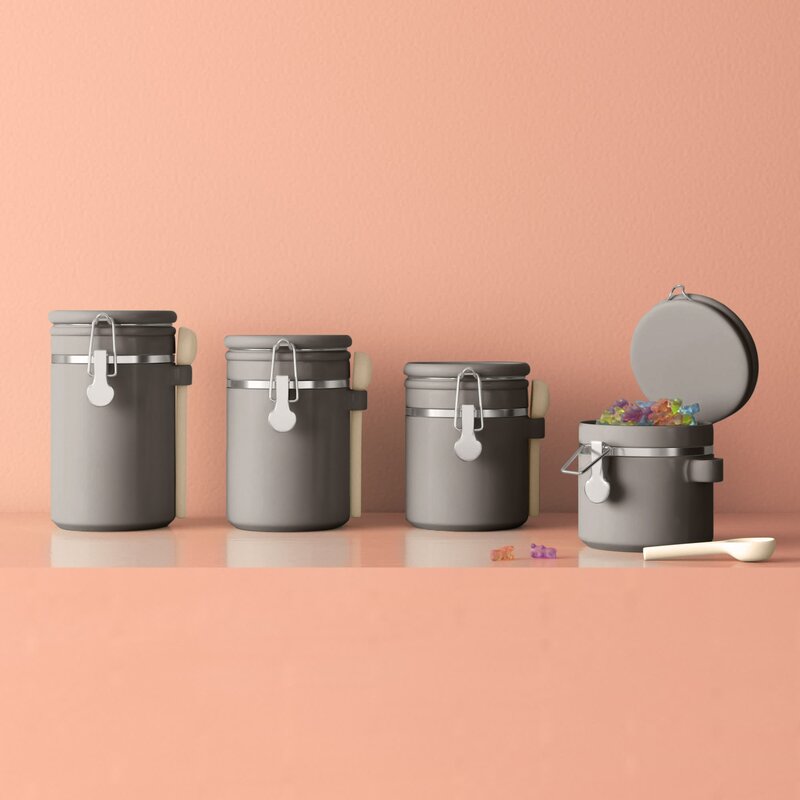 This 4-piece set of matching canisters keeps contents fresh in your pantry or kitchen. Crafted from ceramic with a solid-hued finish, this set shows off classic cylindrical silhouettes with silver metallic details and a handle on the side for balancing measuring spoons. Rounded lids top off each jar, with locking closures that provide airtight seals to keep cookies, spices, and baking ingredients from spoiling. We love that these jars come in four sizes, the largest being 10” high, so they’re right at home on your countertop. Plus, they’re chip-resistant.