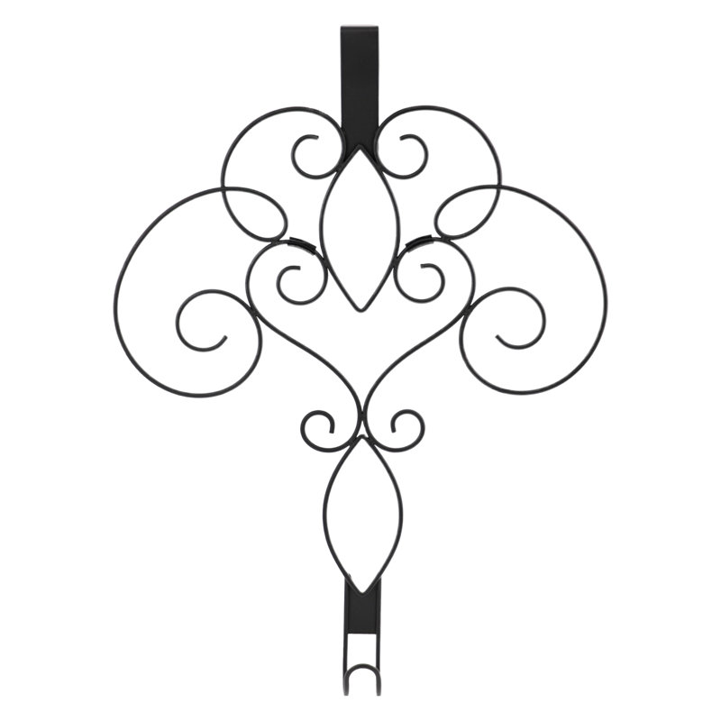 This beautifully crafted scrollwork wreath hangers add a sophisticated touch to any door. Available in two scrollwork designs, and finished in a matte black color. Bumpers placed strategically on the hanger protect the door from scratches, and it holds up to 20 pounds. 18 inches long. Indoor or outdoor use.