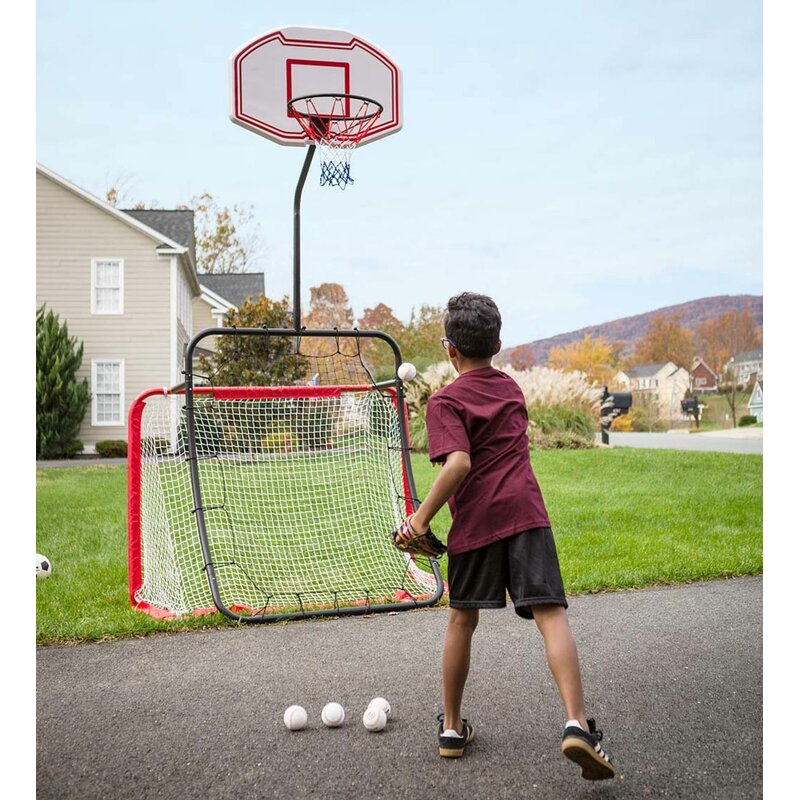Includes basketball hoop, soccer net, baseball rebounder that doubles as a lacrosse bounce-back net