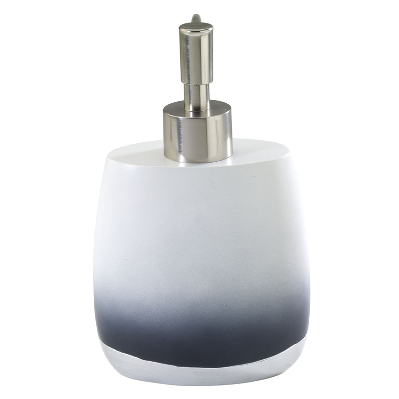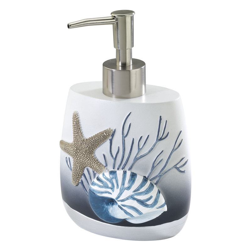 This dispenser is decorated with raised starfish, shells, and coral in shades of blue and beige on an ombre base that goes from off-white to dark blue. A contrasting silver border adorns the bottom. Made of durable resin, hand painted. Imported.