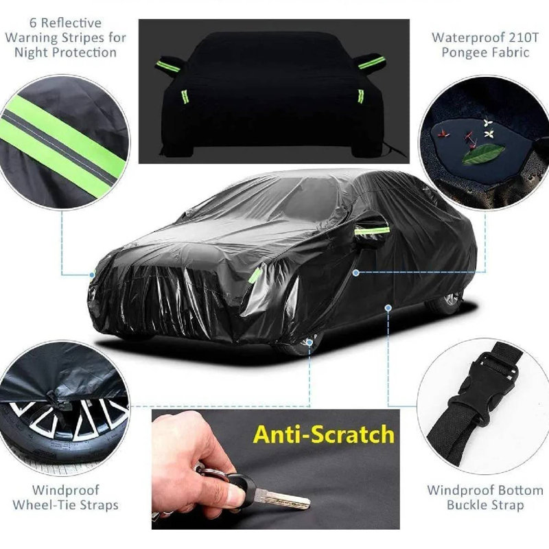 Mirror pockets allow you to easily find the front of the car cover. 6 fluorescent light strips for reflective safety warning lines to ensure safe parking at night. The 4 Wheel-Tie straps and central adjustable buckle strap connect underneath the car to hold your car cover instead of blowing off on windy days. It has an elastic hem around the corner for a snug fit. comes with a small bag for easy storage and transportation.