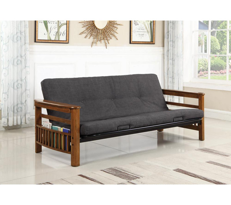 Although the futon is designed for comfort and convenience, don’t forget the futon frame for style and support. This warm brown futon frame is both trendy and sturdy. Constructed of Asian hardwood and backed with metal black decking, this frame is durable and true. Arms have storage capabilities for glasses of water or wine as well as for magazines or the remote. Frame has optional drawers for even more storage (futon pad also sold separately).