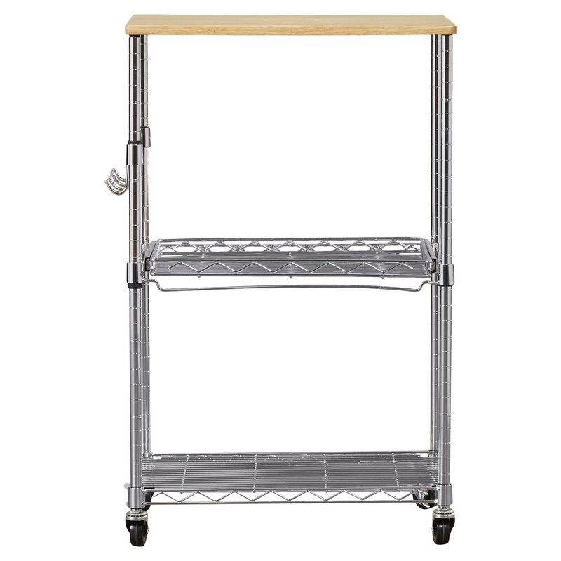 Keep kitchenware, cooking utensils, spices, and ingredients corralled in one place with the help of this kitchen cart! Crafted from a metal frame, it’s founded atop four straight, round legs and features two shelves – one of which pulls out for easy access to your kitchenware. Plus, each shelf is adjustable with 1″ increments to accommodate whatever you need to be stored in your kitchen. Up top, the tabletop provides the perfect place to put a microwave.
