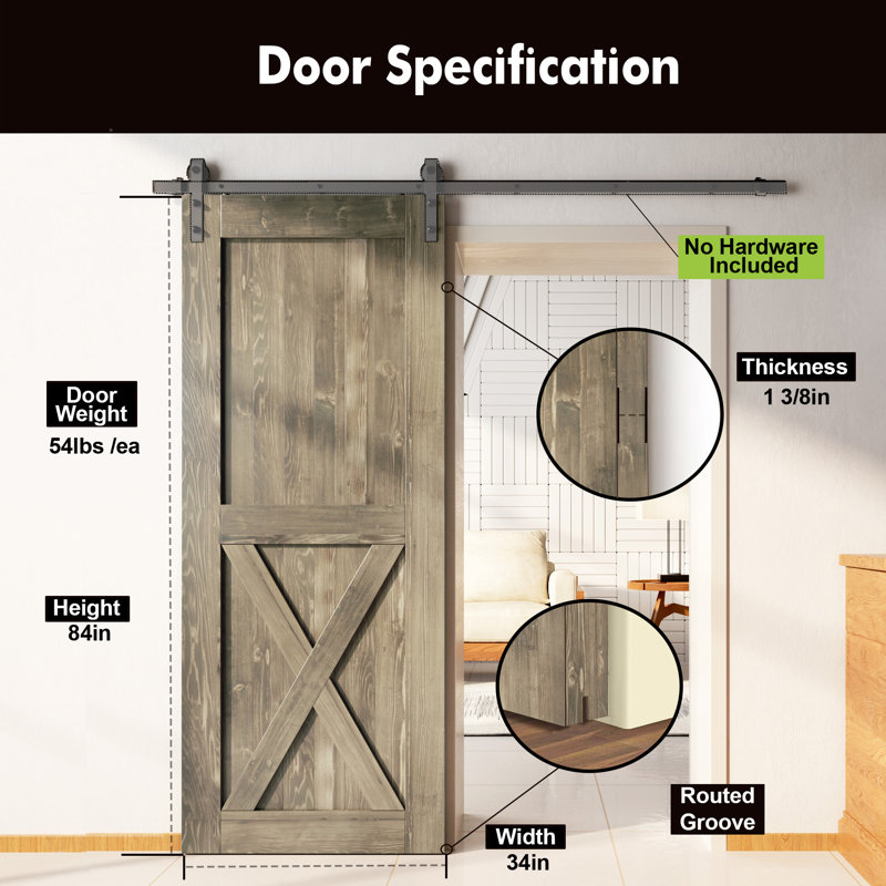 The manufacturer aims to provide the best value products and services to save you time and money when you think of installing barn doors at your home! Pre-install Notice: This door requires two people to assemble, it is not a traditional one-piece barn door. Pilot holes on the door are all pre-drilled and cut. The wooden panel is able to junction with each other for a tight fit. It is an unfinished barn door, you can easily paint it as you wish. Please leave the door dry for at least 24 hours. The barn door will work perfectly with our sliding barn door hardware kit and door handles. The bottom of the door had a pre-cut groove to fit with the floor guide that prevents the door from swinging back and forth.