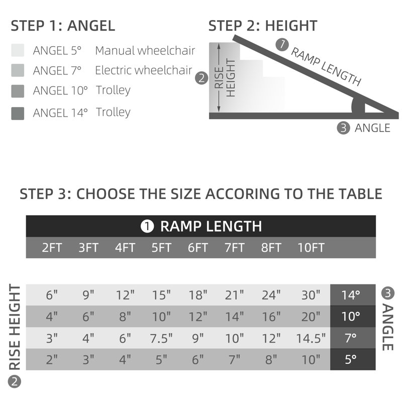 When folded this aluminum ramp is compact enough to put into the back of a car or truck for use anywhere you drive. You can follow the steps to buy this wheelchair ramp. Step 1. Measure the rise of your application. Step 2. Pick the proper ramp length based on your height of use.