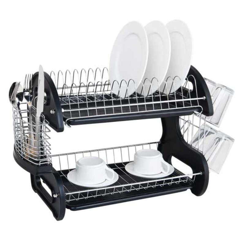 Reclaim your precious countertop space and enjoy double the storage capacity of this two-tier dish rack. With two levels and clever side storage, it provides ample space to neatly organize all your kitchen basics, from cups, mugs, plates, and silverware. Use the top tier to stack plates upright for easy visibility. The bottom tier is perfect to store up to two medium bowls, while the additional side compartments such as the spring-like shaped cutlery holder let you easily airdry and showcase your stunning selection of silverware. An integrated bottom tray catches excess water, keeping your counters safe from spills. When not in use it collapses and folds away neatly to maximize your kitchen space.