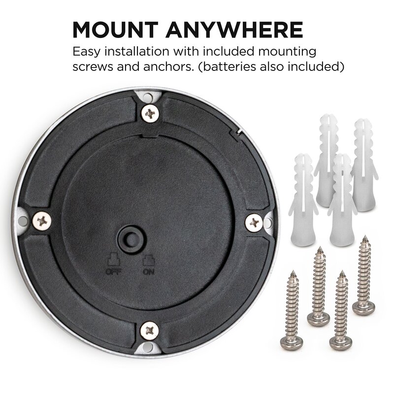 Mount anywhere: Quick and painless installation with no wiring required. Simply push the power button and mount using the included screws and anchors.