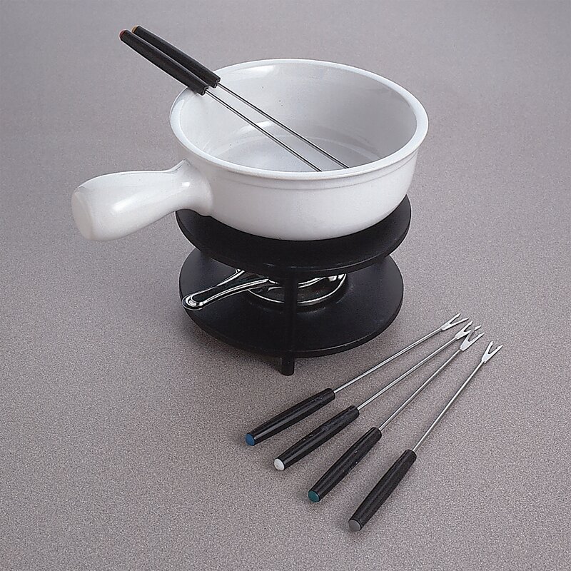 Set includes: fondue pot, base with heat diffuser, alcohol burner, and 6 fondue forks