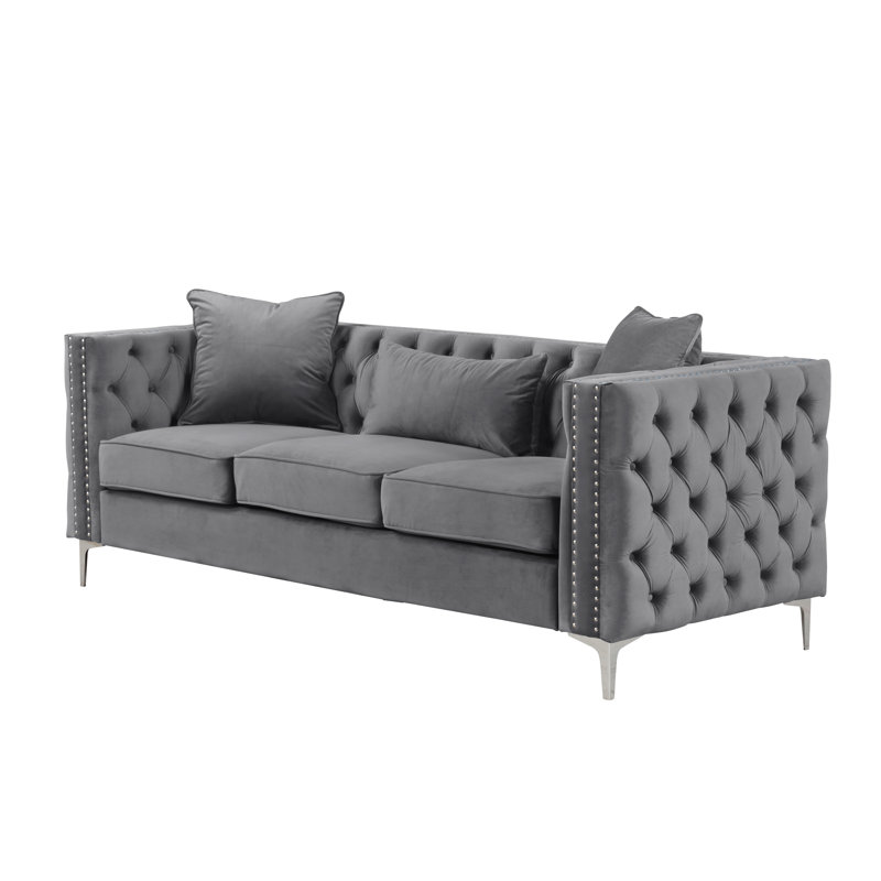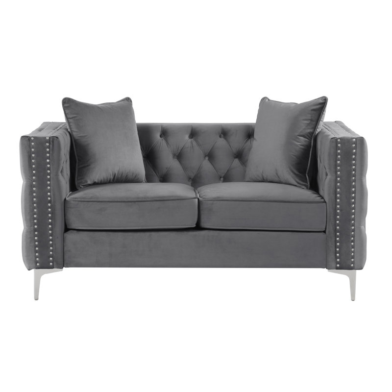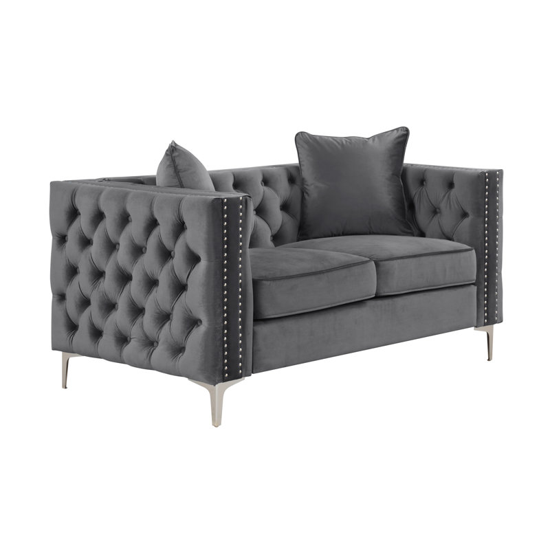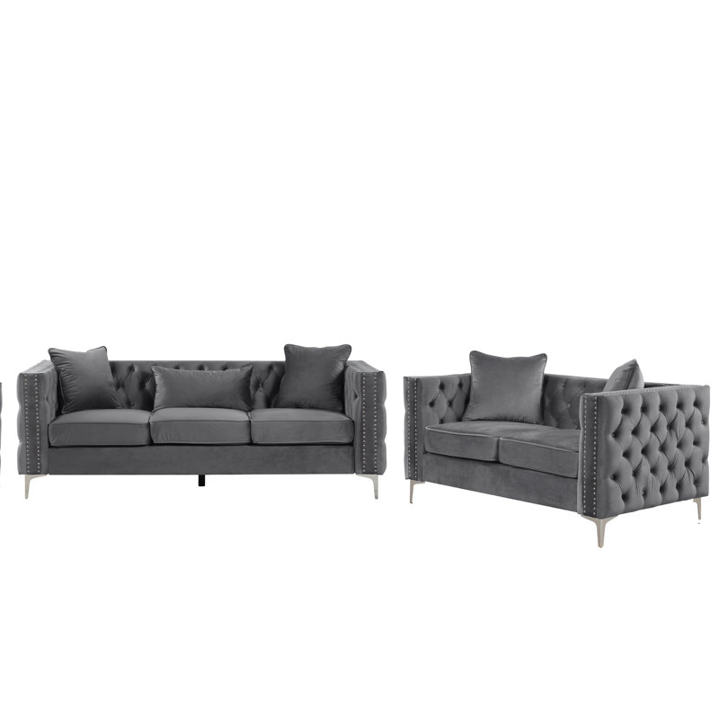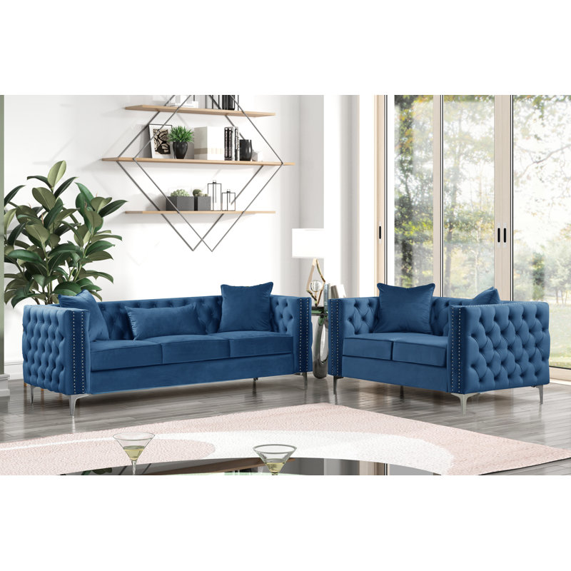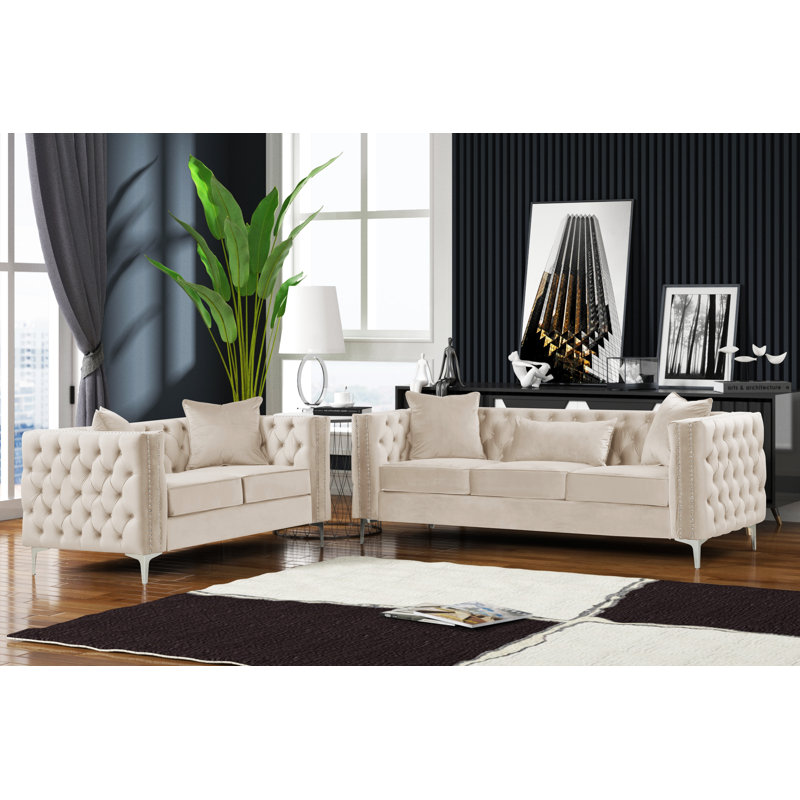 Founded atop smooth, clear chrome feet, this Marti Hickory Modern 2 Piece Living Room Set is crafted with a solid birch frame and filled with foam for a bit of cushioning as it seats up. Velvet upholstery in a solid hue envelops the seat for a touch of texture, while button-tufted details and nailhead trim adorn the design for even more eye-catching appeal.