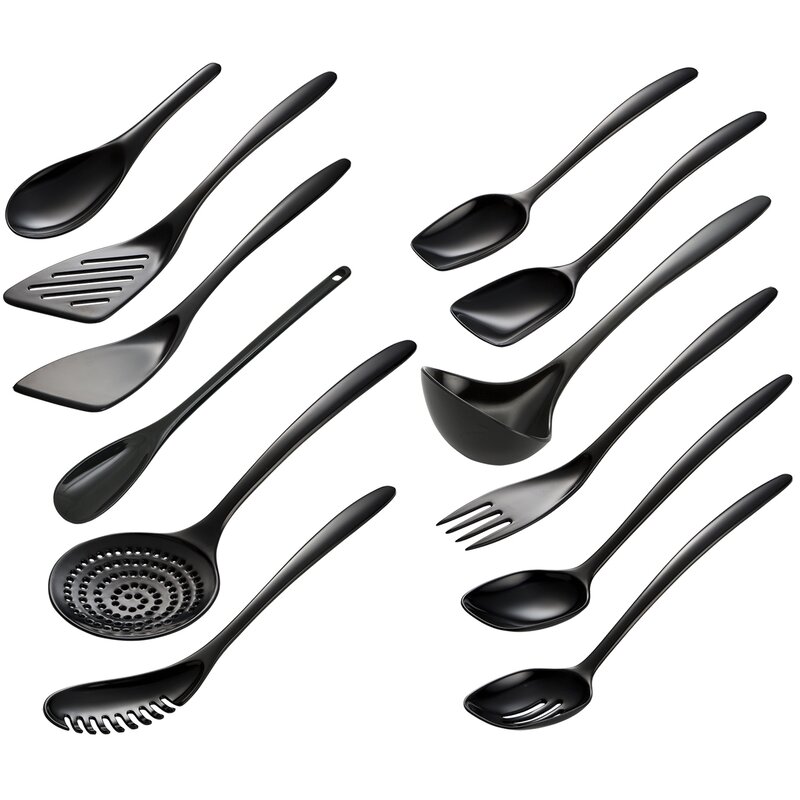 Set Dimensions : 12-Inch Mixing Spoon, 12-Inch Rice/Wok Spoon, 10-Inch Spoon, 11-Inch Wide Angle Spoon, 11-Inch Soup Ladle, 12-Inch Round Spoon, 12-Inch Slotted Round Spoon, 12-Inch Fork, 12-Inch Turner, 12-Inch Slotted Turner, 12-Inch Skimmer, and 12-Inch Pasta Serve