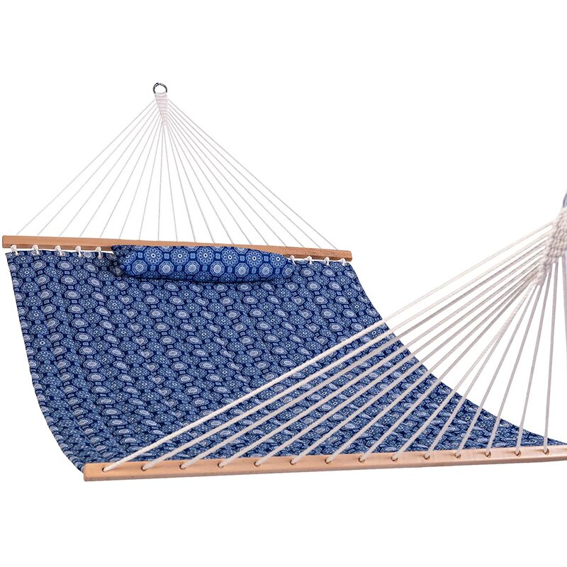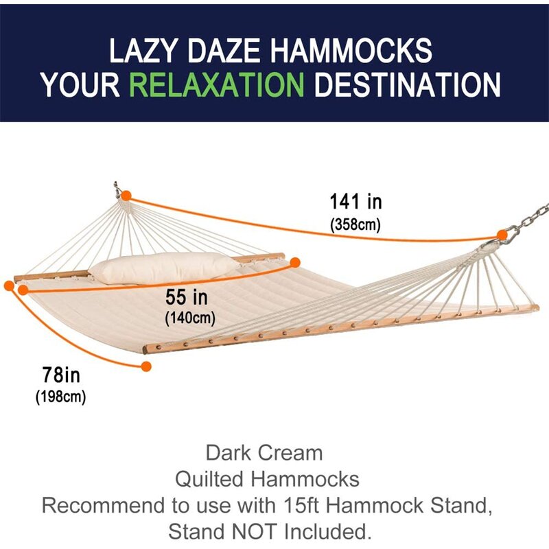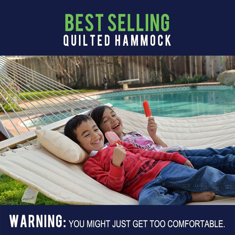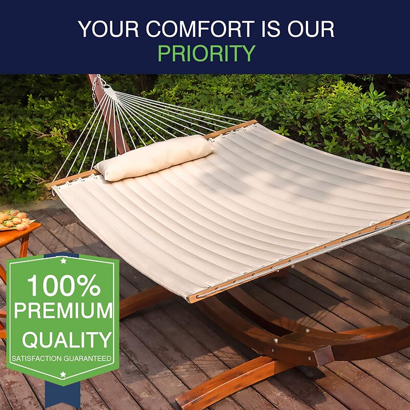 Super comfy the double-layered quilted polyester with inner polyester padding and a polyethylene stuffing head pillow offer superior comfort. No matter it’s in summer or winter, this hammock will always be your first choice for relaxation