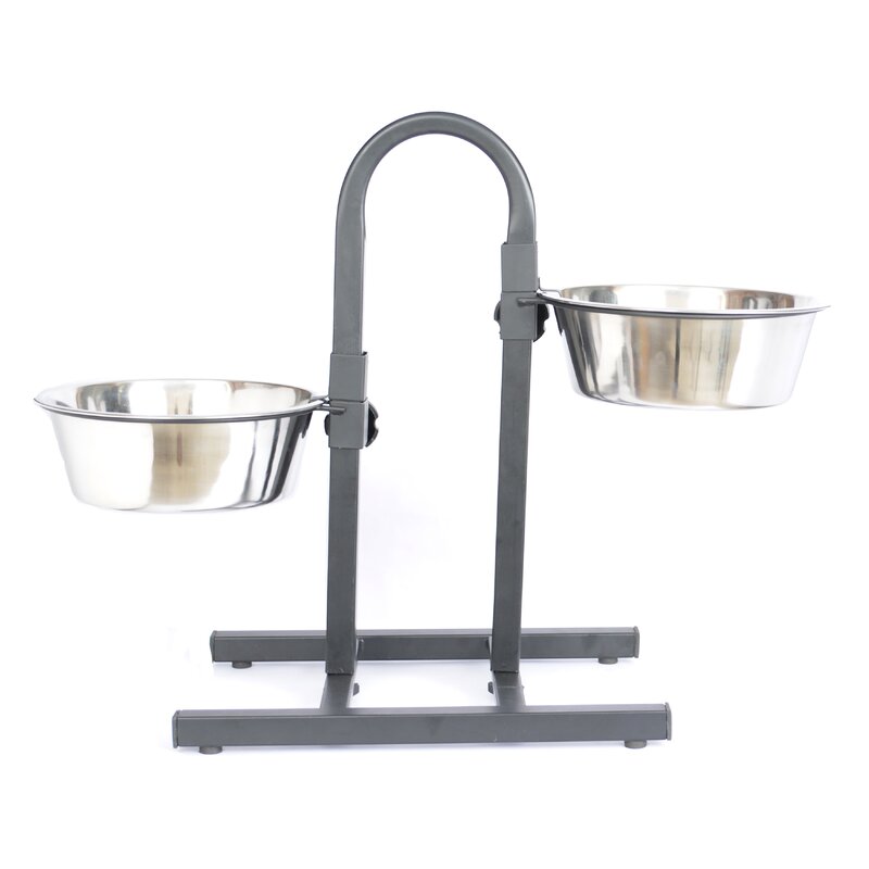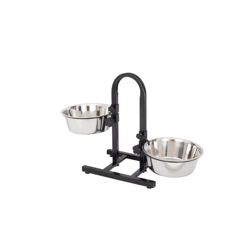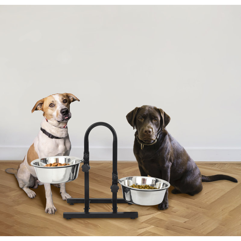 The elevated adjustable pet double diner features a u-design stand with a solid base made of heavy-duty iron metal and two bowls made of high-quality stainless steel with a glossy mirror finish.