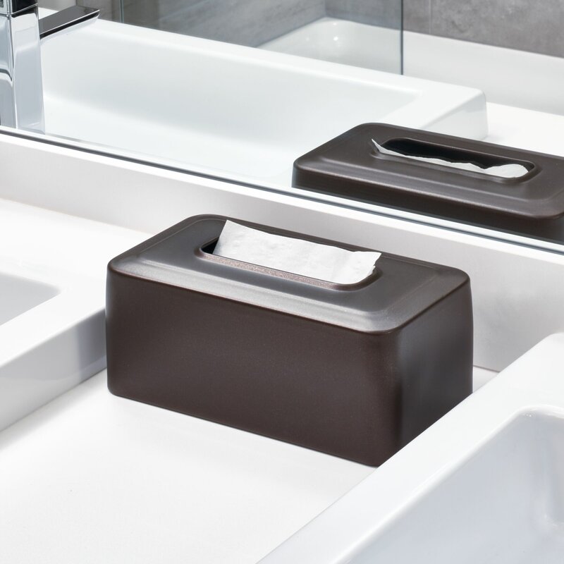Add style and class to your bathroom with the Olivia Tissue Box Cover! This high-quality box slides over your favorite brand of facial tissue to bring luxury to your bathroom or bedroom. Constructed of durable steel with a bronze finish, this box is easy to clean and will last for years to come. The simple brushed design easily matches with any room decor for a cohesive look. The Olivia Tissue Box Cover measures 10″ x 5.5″ x 4″ to fit over rectangular boxes. With design by InterDesign, you can every day.