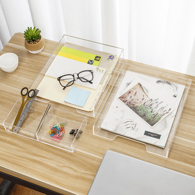 Featuring premium clear acrylic, these 3 desktop document trays can keep your file folders and office supplies efficiently organized. The stacking design makes the most of your desk space and offers easy access to browse or retrieve documents. Perfect for organizing documents, file folders, brochures, and other office essentials. Will not take up extra space while increasing vertical storage space and can keep office desks free of clutter.