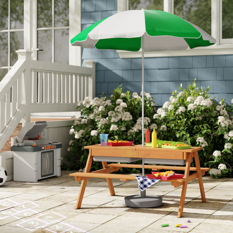 Give your kid a space of their own for playtime, snack time, and more! This kids picnic table comes with one 6-bone removable and adjustable umbrella for kids to eat meals, play games, and more together. This kid’s picnic table with an umbrella is made with solid fir wood so your kids can have a stable playing and eating area that is suitable for daily use. This picnic table can be used in gardens, backyards, or out on the beach! The set includes an umbrella to keep your little one cool and comfortable while they play or enjoy a snack.