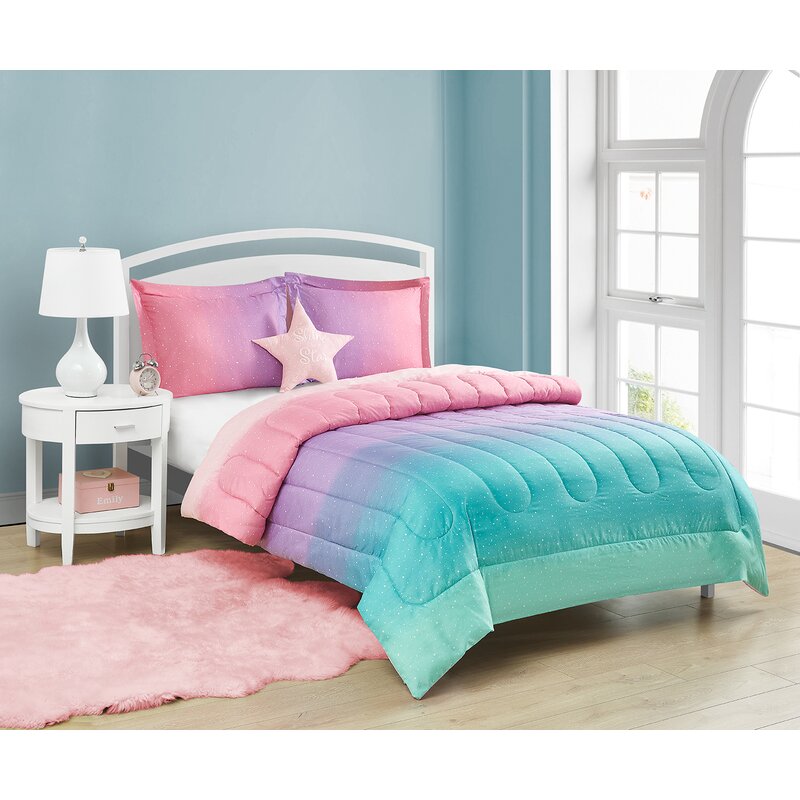 A beautiful ombre of color and tiny stars and moons decorates this Jada Rainbow bed set. Pls. note each sham is cut from the comforter design so each set will be slightly different than the picture but all will match the comforter colors. A “Shine like a Star” glitter-printed typography-shaped star pillow is included with the set.