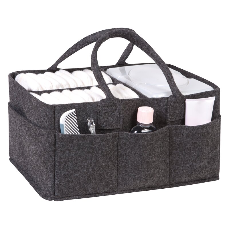 This diaper stacker is a soft sturdy felt that will become an everyday essential item for any new parent. The storage caddy is sectioned and designed to keep diapers, wipes, and changing items organized. With sturdy felt handles, the storage can be easily moved from room to room. It can also be personalized. Keep clutter out of sight or collapse the caddy when not in use.
