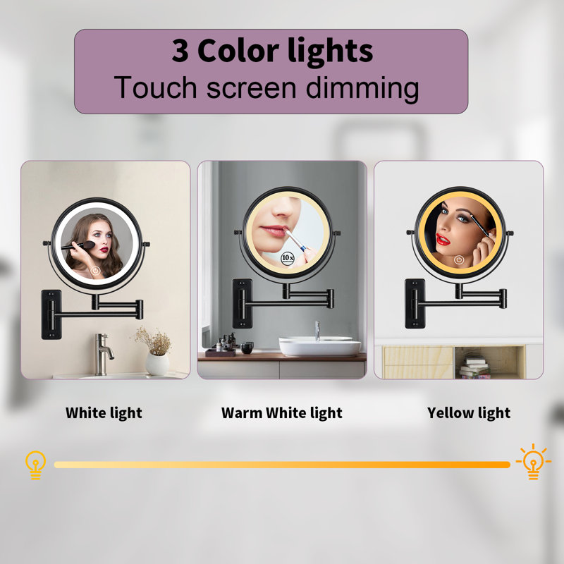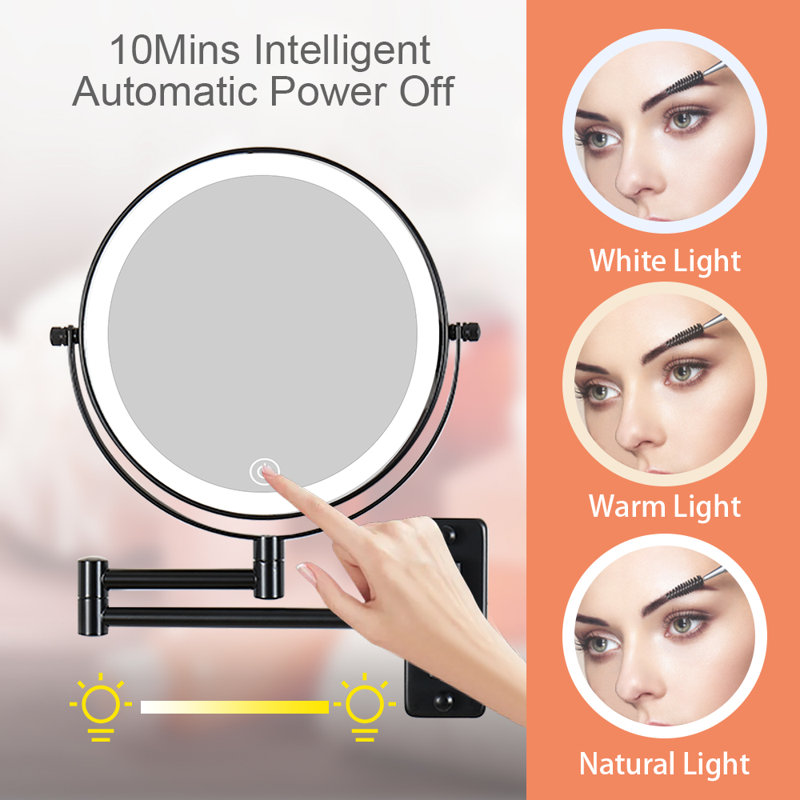 8″ double-sided vanity mirror with tri-color light, one is 1x standard mirror for your overall look and the other is 10x magnifying mirror for detailed makeup like eyeliner.