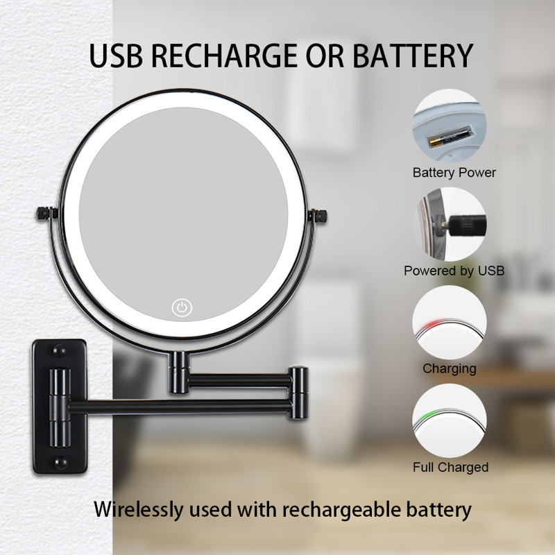 Dual power supply: Our lighted magnifying mirror is powered by 4*AAA batteries (not included) or USB cable (included). This LED vanity mirror itself cannot store electricity. If you need to use a USB cable to charge the battery, please use 4*AAA (Ni-MH battery), other types of batteries cannot be charged with a USB cable, powered by a USB cable will be much brighter than battery power.