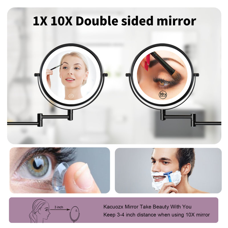 “magnifier vanity mirror with lights:8 inch 1x/10x magnifying mirror.the magnifying mirror with light is double-sided, one is 1x standard mirror for your overall look, and another is 10x magnification mirror for detailed makeup, like drawing eyeliner. The wall mount makeup mirror is double-sided and has 1x and 10x magnification. 1x mirror with light for holistic makeup and skincare. 10x magnifying glass with light for close-up shots of details such as applying eyeliner, mascara, wearing contact lenses, shaving, and more.for clarity, place your face 3-4 inches away from the 10x mirror.