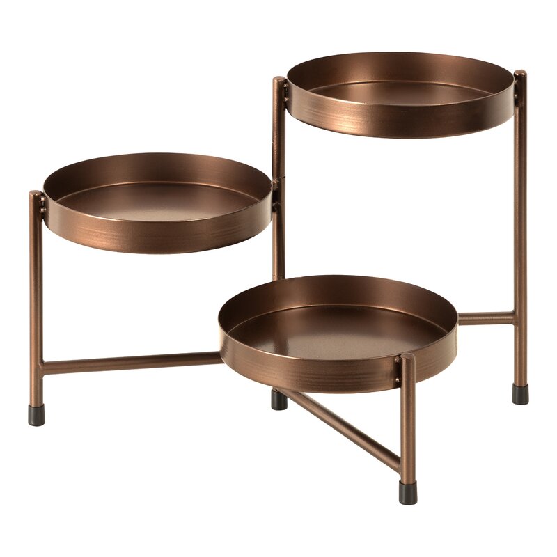 This edition of our Oquendo tri-level plant stand offers a compact design for multiple ways to display. The Oquendo plant stand has a 100% all-metal construction, designed with three tiers for various display surfaces. These three tiers collapse into one another to save space in your home and create a compact accent piece. This plant stand also has smaller dimensions, too; each of the three-round tiers has a 7.25-inch diameter, while the overall height is standing at 10 inches tall. This size is perfect for showcasing the Oquendo on a side, coffee, or dining table. Use the three tiers to create a dazzling botanical-themed centerpiece or to display decor in your entryway, dining room, living room, bedroom, or kitchen. This accent piece isn’t only for plants, either! Use the Oquendo as a storage catch-all for makeup, jewelry, and other household items. It also functions as an excellent dessert or serving tray, making it a fantastic addition to your next gathering or afternoon tea.