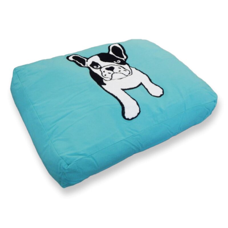 ADORABLE DESIGN: French Bulldog crewel embroidery is playful and fun in bright aqua for a pop of color.